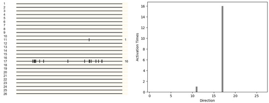 The neuron activation diagram in the twenty-six direction caused by the motion of the 1-voxel random-dot object in the three dimensional space (left). Each line represents 26 directions, each point on the line represents the detection neuron, and each stimulation on the line represents that the neuron at this point is activated. The number of activations represented by a histogram (right). The number of activations of neurons in all directions is displayed on the histogram. The 17th direction neurons have the highest number of activations. It can be referred that the object moves in the 17th direction.