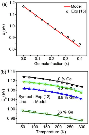 (a) The analytical model (1) calibrated at different Ge mole fractions with experimental data []; (b) for the wide range of temperature, the computed expression observed closely matched with measurement data [].