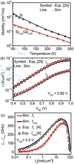 Figure 2a shows the 2D schematic diagram of SiGe HBT with the doping profile of the intrinsic region. Numerical device dimensions and calibrated model parameters are shown in Table 2. The intrinsic collector region is lightly doped (i.e., NC = 3.0 × 1017 cm−3) in the vertical current flow direction (y-direction) to reduce the collector-base (CB) junction capacitance, whereas the intrinsic emitter region is heavily doped with peak emitter doping (NEP = 1.5 × 1020 cm−3) and has a doping gradient of 0.8 nm/dec towards the base region. In order to enhance the intrinsic drift field for electrons in the p + SiGe base, linearly graded Ge with a mole fraction (x) of 0 to 0.26 is used, as shown in Figure 2b. The epitaxial Si1−xGex layer is pseudomorphic and stable in nature using this Ge profile []. Figure 2c shows the equilibrium energy band diagram of n-p-n SiGe HBT with Ge profile. The blue dashed line shows the metallurgical junctions at the emitter-base and base-collector junctions, marked as JEB and JBC, respectively. The linearly graded Ge profile resulted in a bandgap (Eg) variation in the heavily doped p + −SiGe base from 1.05 eV (near the BE junction) to 0.94 eV (near the CB junction). The hydrodynamic (HD) carrier transport model is used for HBT simulations to account for the non-local nature of carrier transport under high electric fields []. The Slotboom model is used for a bandgap narrowing effect []. The temperature dependence carrier mobility models, considering carrier scattering and doping dependence in Philips unified mobility (PhU-Mob) and high-field saturation models are used [,,,,]. The incomplete-ionization model is used in low-temperature simulations to account for active dopant concentration in the lightly doped collector region [,]. Recombination-generation models, such as doping and temperature-dependent SRH (Shockley–Read–Hall) and the Auger recombination model, are invoked []. The non-local electron barrier (e-barrier) tunneling model is used, which considers electron tunneling leakage from the BE junction barrier. In this work, the linear interpolation method for the mole fraction-dependent model parameters is used. A wide range of temperature-dependent calibrated models for Si have been considered in this work []. For mole fraction dependent models of materials, such as SiGe, we use linear interpolation between two parent materials, where we have calibrated the Philips unified mobility (Phu-Mob) model (θ and Nref) for p + −Si0.94Ge0.06 with a doping density of 1.0 × 1015 cm−3, and the experimental data [] is shown in Figure 3a.