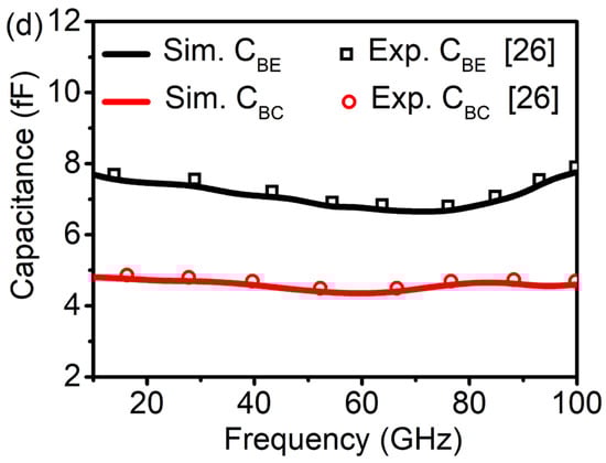 Forward Gummel characteristics, shown in Figure 3b, are reproduced with experimental data [] at 300 K with an emitter area of 0.42 × 5.56 µm2 on 55 nm SiGe HBT. The advanced SiGe HBT in 55 nm BiCMOS uses a reduced emitter area size of 0.1 × 4.9 µm2 for the high-performance target that has been considered in our simulation. The TCAD has the facility to provide frequency dependent small-signal AC analysis with temperature-dependent physical models. The fT, fmax and junction capacitance reproduced with experimental data [,] are shown in Figure 3c,d on the same technology of 55 nm SiGe HBT.
