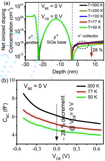 The NM value for arsenic (As)-doped Si is 3.5 × 1018 cm−3, and boron (B)-doped SiGe is 9.0 × 1017 cm−3, which are both considered in the analysis []. Here, the net doping concentration in the emitter and base regions is higher than the NM value. Therefore, all dopants in the emitter and base are fully ionized even at cryogenic temperatures, as shown in Figure 5a. However, it is observed from Figure 5a that the net ionized doping concentration in the intrinsic collector is reduced by 28% as the temperature is lowered from 300 K to 50 K. This is due to incomplete ionization of dopants in the lightly doped collector region (NC < NM) near to the CB junction. The impact of decrement in ionized dopant concentration results in a widening of the depletion width in the collector region. The incomplete ionization effect near to the junction in the lightly doped collector (<NM) region has the advantage of reducing depletion capacitance. From the simulation results, it is observed that a reduction in net ionized doping concentration due to dopant incomplete ionization at cryogenic temperatures result in an equivalent decrease in the CB depletion capacitance (CBC), as shown in Figure 5b.