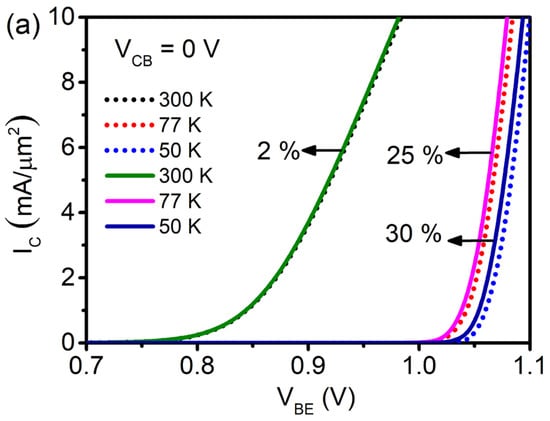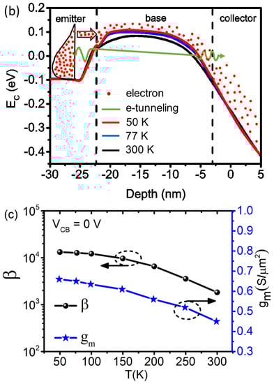 An additional e-barrier tunneling model is included with hydrodynamic carrier transport to investigate electron tunneling leakage through the BE junction. This tunneling leakage current along with thermionically injected electrons constitute the IC []. Figure 6a shows the IC with and without e-barrier tunneling for temperatures of 300 K, 77 K, and 50 K. In the work by Ying et al. [], it can be observed that the collector current, including the quantum mechanical tunneling model, is close to the experimental data. The effect of the inclusion of the e-barrier tunneling model can be observed in Figure 6a, where the percent increment in collector current is from 2% to 30% with the change in temperature from 300 K to 50 K. Figure 6b shows the physical illustration of the e-barrier tunneling through the base potential barrier from the emitter-base junction and contributing to IC. Under cryogenic working conditions, the intrinsic carrier concentration (ni) drops and there is an increase in the built-in potential at the junctions. Because of the increment in threshold voltage with an increase in the built-in potential, a larger VBE is required to achieve the same IC at a lower temperature []. Hence, at low temperatures, the barrier tunneling leakage phenomenon cannot be ignored for numerical analysis.