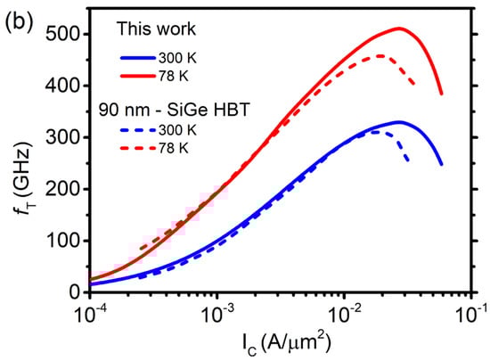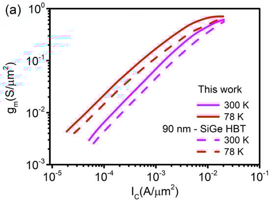 The simulated results are compared with commercially available data (advanced 90 nm SiGe HBT measurement at 300 K and 78 K) for performance analysis []. In the linear current regime, the gm increases exponentially and slows down with the high current regime; this follows the same behavior as collector current at fixed temperatures, as shown in Figure 3b. This work shows 1.5 times higher gm values with respect to the measured 90 nm SiGe HBT data (IC = 1 mA/µm2), as shown in Figure 8a. The fT analysis also shows that the simulated work is better than the measured values, as shown in Figure 8b. Even the drive current is higher in this work, which is very desirable for high performances. The IC values are (at peak fT) 2 × 10−2 mA/µm2 in 90 nm SiGe HBT and 2.8 × 10−2 mA/µm2 in our work. A comparison of different metrics is summarized in Table 4.