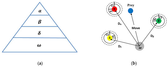 With the purpose of finding the optimum factor Xopt, the GWO is implemented. The GWO is a new swarm intelligence algorithm that mimics the social and hunting behavior of grey wolves. The wolves’ society has a strict hierarchical system, divided into four groups, as shown in Figure 1a, where the leaders wolves called α, who represent the optimal solution; β and δ wolves giving assistance to leaders in the decision-making process, denoting the second and third most suitable solutions; and ω wolves behaving as followers of the order [28].