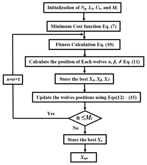 The final step is the attacking step, which occurs when the wolves converge on the prey, which happens until the maximum number of iterations Mi is reached. The best wolf position to the prey is the Xα, employed then as Xopt in (8) and (9), in order to achieve an appropriate current prediction that corresponds to the minimum cost function. The flowchart of the proposed GWO algorithm is depicted in Figure 2.