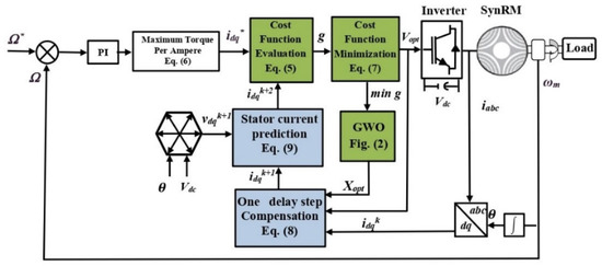 It should be noted that the GWO’s exploration mechanism will prevent Xopt from becoming stuck at one optimum value. Consequently, as opposed to MFPCC methods in [15,17,18,24], the proposed method has a low tuning effort, simple structure, intuitive, and fast optimization process. The control diagram of the SynRM drive system based on the proposed method is shown in Figure 3.