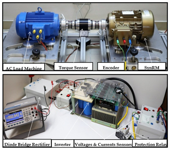 The modeling and simulation of the SynRM drive system, and the proposed control schemes were carried out in Matlab/Simulink environment. The machine dynamic model takes into account the magnetic saturation and iron losses, as described in [35]. Table 1 shows the parameters of the SynRM. Moreover, the experimental test rig comprises basically a 2.2 kW SynRM (with the same parameters reported in Table 1) coupled to an AC load machine, a Powerex POW-R-PAK voltage source inverter, a diode bridge rectifier, and the dSPACE DS1103 digital controller. Figure 4 shows the experimental setup.