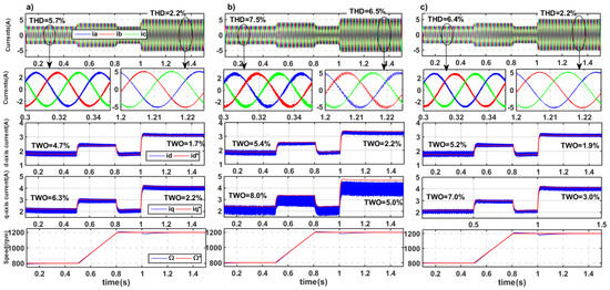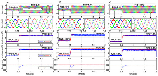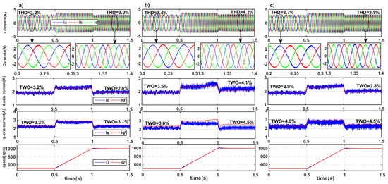 Experimental results under 2 N.m and speed variation: (a) MBPCC with nominal parameters, (b) MBPCC under the influence of parameter variations (0.5xLd, 0.5xLq), (c) proposed GW−MFPCC.