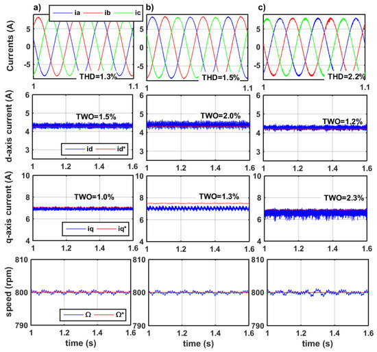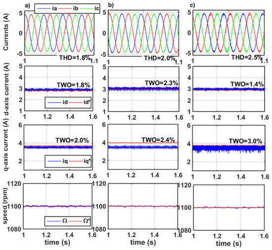 To better evaluate the dynamic performance of the considered control strategies, comparative tests are conducted and shown in Figure 8, where a load torque is instantaneously applied at the instant t = 0.5 s from no-load to 5 Nm, under a constant speed reference of 600 rpm. It can be observed that all the control strategies can achieve a fast dynamic response and that the rotor speed tracks its reference with good stability and accuracy after a slight drop due to the load step. Regarding the performance of currents, the zoomed figures of the steady-states show that the proposed GW-MFPCC has sinusoidal current waveforms, similar to the ones of the MBPCC with nominal parameters, with a slight difference in THD values (see Figure 8a,c). It is obvious that the GW-MFPCC performs better than the MBPCC in terms of d-axis current performance under the steady state, providing smooth and close tracking of the reference. On the other hand, the GW-MFPCC, has slightly lower q-axis performance than the MBPCC, with a tiny difference in TWO, but it offers perfect reference tracking capabilities. On the contrary, since the MBPCC is highly dependent on accurate parameters, sinusoidal current waveforms cannot be achieved when mismatched inductances are assumed, as shown in Figure 8b, allowing a poor THD performance. The dq-axes currents have the worst steady-state ripples, resulting in high TWO values, and a significant offset in the q-axis current was observed, which increases as the load torque increases. From the considered control strategies, it can be concluded that the MBPCC performance with incorrect parameters degrades more and more as the load torque increases, while the proposed GW−MFPCC shows a high immunity against the SynRM parameter variations and a great robustness against strong and fast load torque variations.