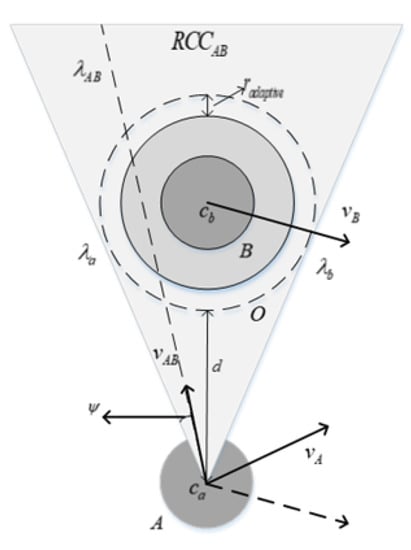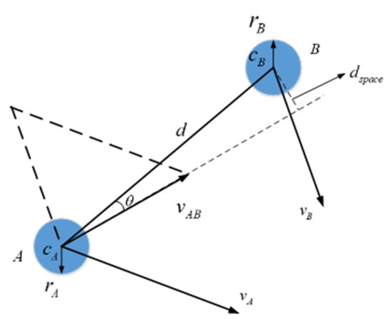 As shown in Figure 2, the adaptive velocity barrier method adds a dynamically changing extended radius to the classical velocity barrier method of extending the radius to the barrier. The radius of the adaptive velocity obstacle method’s extended obstacle O is expressed as: