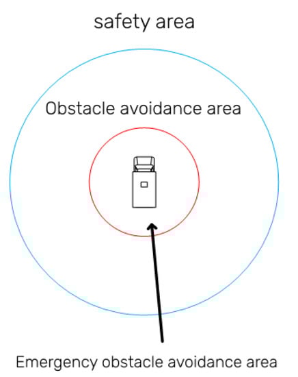 However, the prediction results of the Kalman filter are not very accurate at the beginning, with a high estimation error; however, this error will gradually decrease with several iterations and finally stabilize. Therefore, we set up a triple area in the range that an AGV can sense, as shown in Figure 3. The outermost layer is the safety zone, where the obstacle is far from the AGV distance, such that the threat level is small. We temporarily do not need to consider obstacle avoidance at this time, and Kalman filtering for the location of the obstacle is updated iteratively in order to obtain more accurate prediction results. The middle layer is the obstacle avoidance layer in which the AGV uses the Kalman filter’s estimation results to construct a risk collision buffer which guides the AGV in avoiding obstacles, such that the AGV can adjust its attitude as soon as possible to drive away from the obstacle. The final layer is the emergency obstacle avoidance layer, which seeks to avoid driving into the area of the obstacle.
