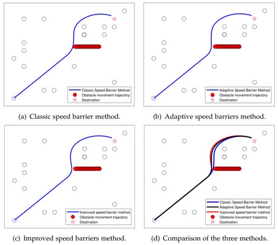 Figure 6 compares (a) a classic speed barrier method combined with a dynamic obstacle avoidance path window, (b) an adaptive speed barrier method for the obstacle avoidance path, (c) the algorithm proposed in this paper for the obstacle avoidance path, and (d) the three obstacle avoidance paths in contrast, where the blue path is the traditional method [17], red is the adaptive speed barrier method [18], and black is the proposed algorithm. In combination with the results reported in Table 1, it can be seen that the traditional obstacle avoidance method did not consider security in the obstacle avoidance process, so it chose the path with the highest efficiency when discovering and avoiding obstacles.