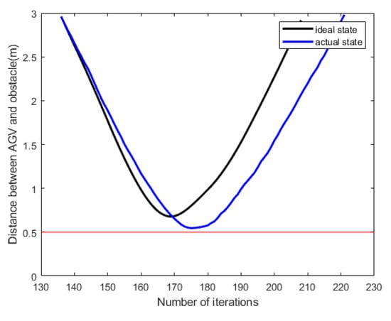 Figure 7 shows a comparison between the AGV and the distance to the obstacle from the time it detects the obstacle to the time it leaves the obstacle, with and without consideration of the slip factor. The abscissa represents the step size and the ordinate represents the distance from the obstacle. It can be seen that the speed of the AGV could not reach the expected speed due to skidding, leading to an extension of the entire obstacle avoidance cycle. Therefore, the nearest distance between the AGV and the obstacle was closer and more dangerous than the ideal case. Therefore, it is necessary to ensure a sufficient safety distance between the AGV and the obstacle in order to deal with uncertain factors in the obstacle avoidance process.