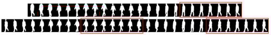 Two complete gait cycle sequences from subjects ‘01’ and ‘10’ on CASIA-B. The top periodic sequence contains 24 frames, while the bottom contains 30 frames; the quality of frames in the sequence is different, and the frames with clear outlines and rich information are regarded as key frames (such as the frames in the red box).
