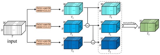 As shown in Figure 3, the input of MTA module has a dimension of , which represents the number of channels, sequence length, and size of each frame, respectively. In order to capture the temporal features with different scales, which are denoted as , , and , respectively, MTA employs three parallel convolutions, which adopt different sizes of the kernel. The specific parameter settings of the convolutional layers are shown in Table 1, especially, the three convolutions stride are all three.