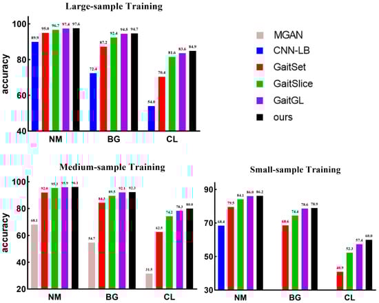CASIA-B. Contains the gait sequences of 124 subjects, CASIA-B is a widely applied gait dataset, and each subject contains 3 walking conditions and 11 views (0°~180°, with an interval of 18°). The walking condition contains normal (NM) (six sequences per subject), walking with a bag (BG) (two sequences per subject), and wearing a coat or jacket (CL) (two sequences per subject). In other words, each subject contains 11 × (6 + 2 + 2) = 110 sequences. As there is no official partition of training and test sets of this dataset, we conduct large-sample training (LT), medium-sample training (MT), and small-sample training (ST) according to Chao et al. [] During the testing stage, the first four sequences of the NM condition (NM#1–4) are stored in the gallery set and the remaining six sequences (NM#5–6, BG#1–2 and Cl#1–2) are stored in the probe set.