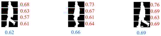 In order to better understand the role of the MFAM module, the importance scores of several frames are given in Figure 7. It is worth noting that we horizontally divide the human body into 32 parts in the model, then calculate each part’s importance score. For the convenience of illustration, the average of the importance scores of the adjacent eight parts is calculated in Figure 7. In other words, we show the weights of the four parts of the human body. It can be seen from Figure 7 that the importance scores of each frame in the sequence are different, indicating that the frames contain different degrees of semantic information.