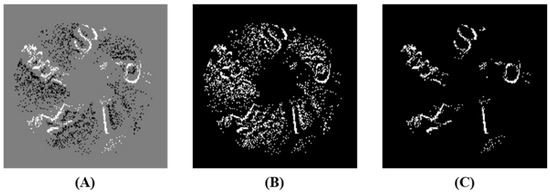 Under laboratory conditions, this paper used a speed-adjustable fan as the high-speed scenario and recognized the letters on the blades, which is shown in Figure 6. There were 5 letters to recognize and the range of the rotating speed of the fan is from to . In order to only acquire one letter at a time, an ROI would be automatically set in advance, and only events in the area were taken into account. The steps to set the ROI are shown in Figure 6.