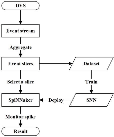 An ideal high-speed object recognition system should have the characteristics of high accuracy, low power consumption and low latency. Since information is delivered as spikes, the third generation of neural networks, known as spiking neural networks (SNNs), have the sparsity of asynchronous computing. In comparison to artificial neural networks (ANNs), SNN’s utilization of bionic neurons allows the processing of information in the manner of the human brain, and it has the advantages of low power consumption and low latency, as well as a natural spatiotemporal information processing performance. However, SNNs can only benefit from their low power consumption and low latency if they are deployed on a neuromorphic computing platform [4,5,6]. At present, many neuromorphic computing platforms such as SpiNNaker [7,8], Loihi [4] and TrueNorth [9] have been developed. For data acquisition, high temporal resolution and low latency are required in high-speed scenarios. Dynamic vision sensor (DVS) [10], a neuromorphic vision sensor, has these characteristics, and the output is an asynchronous event stream rather than frames, which matches the asynchrony of SNN.