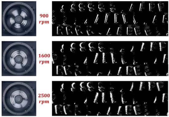 When it comes to the experimental scene, some research employed rotating fans to simulate high-speed scenes and performed several computer vision tasks [25,26,27,28]. Zhao, J. et al. [25] and Zheng, Y. et al. [26] applied a neuromorphic vision sensor in image reconstruction of high-speed motion scenes. Zhang, S. et al. [28] presented an adaptive framework for detecting high-speed moving objects by combining DVS with traditional detection algorithms and showed that DVS could get sharp contours without motion blur, which was helpful for feature extraction and recognition. In this paper, we employ DVS to acquire data from a similar experimental scene and apply an SNN for recognition. By combining asynchrony and sparsity, we significantly reduce the latency and computation.