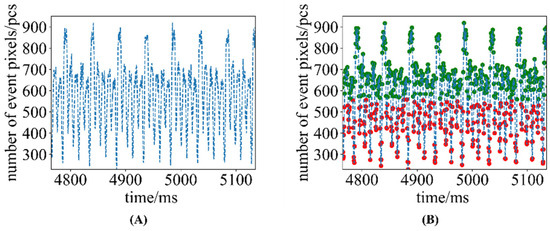 Illustration of the selection strategy. (A) is the change in the number of event pixels in the ROI over time when the fan rotates. (B) is the result of using the Gaussian Mixture Model to separate out event slices containing letters. We discard invalid event slices that do not contain letters, and select only one event slice per letter for recognition.