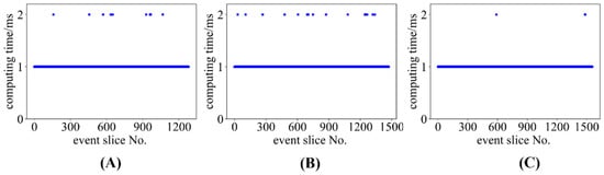 Computing time of SpiNNaker at different rotating speeds. (A) is computing time at ; (B) is computing time at ; (C) is computing time at . The computing time is basically kept at at all speeds, except for some outliers of .