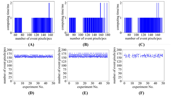 Computing time along with number of event pixels and the number of event pixels in outliers in repetitive experiments. (A–C) are computing time at , and , respectively; (D–F) are the number of event pixels in outliers at , and , respectively. Outliers with computing time of probably occur when event pixels are more than 150.