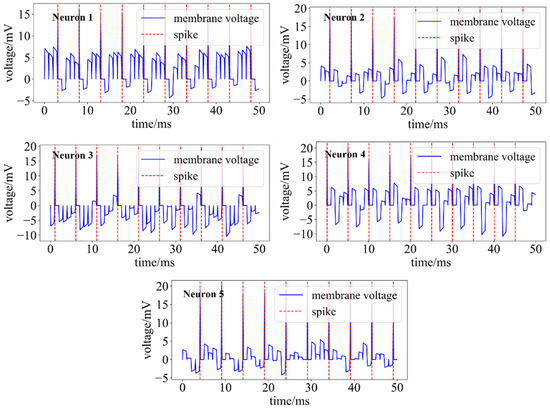 Membrane voltages of five neurons in the output layer. It takes one time step () to recognize an input, and the neuron representing the recognition result will fire a spike. Additionally, the membrane voltage is reset to ( ) at each time step to eliminate the memory of the previous input.