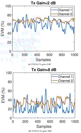 - EVM reduces with the increase in the Tx gain of the USRP or an increase in the Rx gain of the USRP, except for some Tx-Rx gain combinations where the Tx amplifier of the USRP is overdriven.