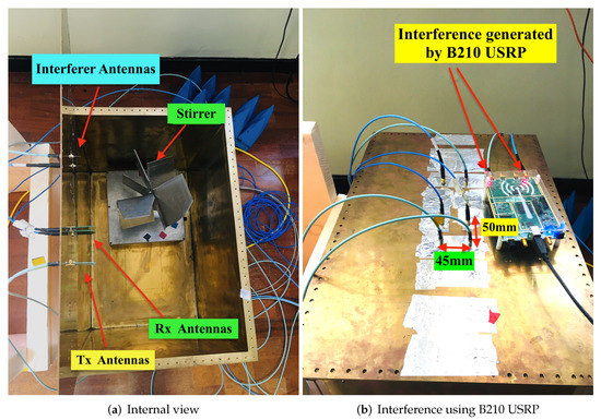 - Lodro, M.; Smart, C.; Gradoni, G.; Vukovic, A.; Thomas, D.; Greedy, S. Near-field BER and EVM Measurement at 5.8 GHz in Mode-stirred Metal Enclosure. Appl. Comput. Electromagn. Soc. J. 2020, 35, 1080–1088. [Google Scholar] [CrossRef]
