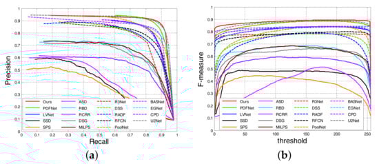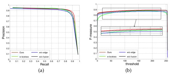 (better viewed in color) Quantitative evaluation of our network and ablation network: (a) P-R curves, and (b) F-measure curves.