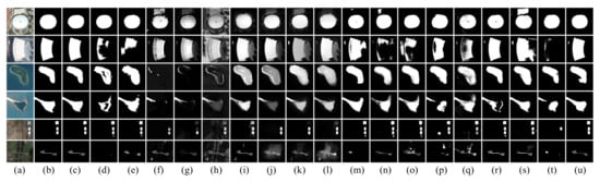 In addition, Figure 3 shows the qualitative analysis of different models. It can be seen that our model can more completely highlight irregular objects and multiple objects. For example, in Figure 3f,g, the large object is not completely detected, whereas the saliency map is incomplete. In stark contrast, our model can give an accurate saliency prediction, and the object is completely highlighted. In Figure 3m,q,r, the saliency maps cannot completely highlight salient objects. Similarly, in Figure 3, the existing models cannot highlight the fifth row of objects, whereas the saliency maps only detect parts of salient objects. Meanwhile, we can find that our model, Figure 3c, can completely and accurately highlight salient objects. This is mainly a benefit of the edge module of our model, which provides accurate edge information for salient objects.
