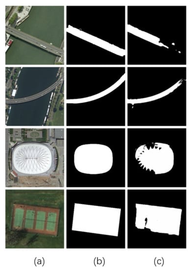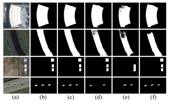 According to the aforementioned descriptions, the proposed model can accurately highlight salient objects in optical RSIs. However, our model is still incapable of generating satisfactory results when dealing with the different scales of salient objects shown in Figure 6. For instance, the two examples in the first and second rows of Figure 6 present two salient objects, i.e., bridges and tiny vehicles. As presented in Figure 6c, our model falsely highlights the background regions around the salient objects. It can be seen that the predicted saliency maps cannot completely highlight salient objects when dealing with the tiny white vehicles. For the bottom two examples in Figure 6a, a roof with patterned lines and a stadium with shadows are where the contrast between salient objects and background is low. As presented in Figure 6c, our model is incapable of highlighting salient objects. Therefore, we can conclude that the scene with different-sized salient objects are still challenging for our model. To address this issue, we should pay more attention to the design of the effective integration methods for multi-level deep features, providing more discriminative representations for salient objects.