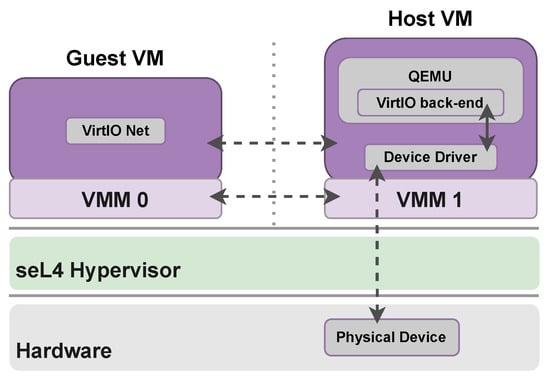- VirtIO can be used for interfacing VMs with host device drivers. It can support the VirtIO driver backends and frontends on top of seL4. VirtIO interfaces can be connected to open-source technologies such as QEMU, crosvm, and Firecracker, among others. In this scenario, the open-source technologies will execute in the user space of a VM different from the one using the device itself. This approach helps in achieving reusability, portability, and scalability. Figure 5 shows the representation of such an approach considering a VirtIO Net scenario in which a Guest VM consumes the services provided by a back-end Host VM.