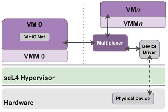 Figure 5. VirtIO drivers example on top of seL4 hypervisor. - VirtIO interfaces can be connected to formally verified native device drivers. The use of such kinds of device drivers increases the security of the whole system. Moreover, the verified device drivers can be multiplexed to different accesses, switching device access between multiple clients. The multiplexer is transparent to native clients, as it uses the same protocol as the (native) clients use to access an exclusively owned device. Figure 6 shows the representation of a device virtualization through a multiplexer. In this example, each device has a single driver, encapsulated either in a native component or a virtual machine, and is multiplexed securely between clients (https://trustworthy.systems/projects/TS/drivers/, accessed on 6 November 2022).
