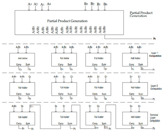After generating the partial products, each column with the at most height of h = 3 is considered, and the reduction of layers [25] takes place. The schematic design of conventional 4 × 4 Wallace multiplier is shown in Figure 3. Depending on the number of entries in the column, either single-bit half adders [26] or full adders are used to process the layers, i.e., if a single bit is passed on to the next layer as a carry over, and if two or three partial products are present in the column as entries, then they are passed through the half adder and the full adder, respectively. The sum and carry generated from the previous layer are passed on to the next set of entries. This process is repeated until it reaches the terminal layer, which consists of only a pair of entries in each column.