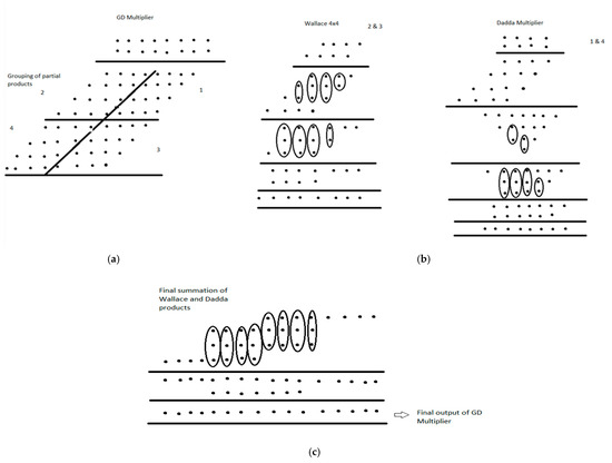 - Parallel grouping of partial products and decomposition of grouped bits using a 4 × 4 Wallace and a 4 × 4 Dadda multiplier.