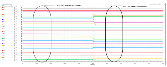 The proposed GD multiplier architecture produces the same product result as the Wallace or Dadda multiplier for any set of binary input patterns chosen. The obtained GD multiplier product result for the sample input patterns, x = 10110110, y = 10011100 and x = 11110000, y = 00001111, are shown in Figure 8. The logic high value is mentioned as 1.8 V, and the logic low value is mentioned as 0 V. The time duration for each bit is 50 ns.