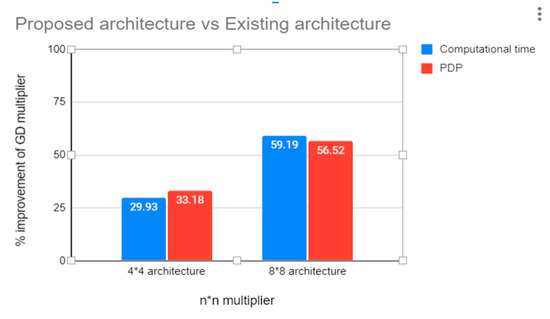 The bar graph shown in Figure 9 shows the percentage improvement of the proposed GD multiplier with respect to the existing multipliers in terms of power–delay product (PDP) and computational time. It can be inferred that with higher-order multiplication, the proposed multiplier shows a better improvement in terms of PDP and computational time. From the graph, one can see that the 8 × 8 architecture has an improvement of approximately 30% in performance parameters over the 4 × 4architecture of the proposed architecture.