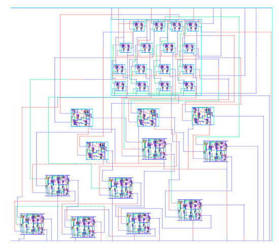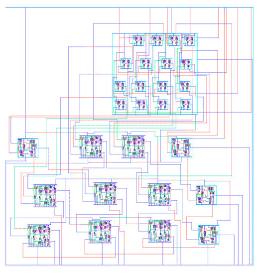 The physical design implementation of the 8 × 8 GD multiplier is shown in Figure 12. This is achieved through the interconnection of the schematic-driven layout of 4 × 4 Wallace and Dadda multipliers, a half adder, and a full adder cell, as per the front-end design.