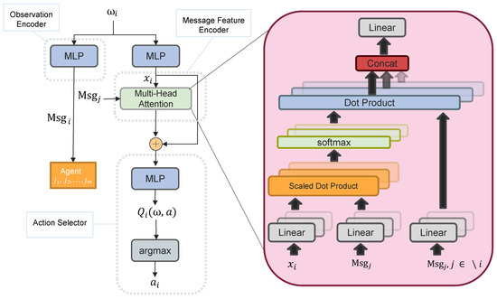 After receiving messages from adjacent agents, we expect the agent to explore useful information from the messages adaptively. Intuitively, the agent will query the messages for information relevant to its observations. One naive strategy to distinguish useful information could be the adoption of some predefined rules, such as giving higher weights to messages sent by close agents. However, this could be too poorly scalable. In this paper, we encourage the agents to find which messages are relevant in a learnable way. To this end, we introduce a multi-head attention mechanism in the message feature encoder module and merge it into the estimation of the Q-value function. Attentional mechanisms can be viewed as differentiable key–value memory models [21,32]. The attention module can better find the relationship between its observations and the received disordered messages than linear and convolutional layers [33].