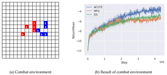 We chose the “Combat” environment in ma-gym as a cooperation confrontation scenario. Two opposing teams battle in a 15 × 15 grid as shown in Figure 2a, each team has five agents, and their initial position are sampled uniformly around the team center in a 5 × 5 square around. Each timestep, an agent can move in one of the four directions (up, down, left, and right) or attack the enemy within shooting range. After an attack, agents need a cool-down time during which they cannot attack. Our model controls one of the teams, and predefined rules control the other team. They attack the nearest enemy agent at their attack range, and the agents in the team share the observation range. This visual sharing setting provides an advantage to the team controlled by the rules. If a team of agents loses the game or reaches the time limit, they will receive a −1 reward. In addition, it receives a reward of −0.1 multiple, the sum of the enemy agents’ health to encourage attacks on the enemy side. Each agent has a starting life value of 3 points, and it will die when the life value is less than zero. When one team’s agents are killed within 40 timesteps, the other team will win. Otherwise, it is a tie.