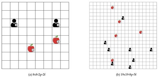 Level-based foraging (LBF) environment is a mixed cooperative–competitive grid game that focuses on the agents’ cooperation. Agents must navigate the environment and collect food items randomly scattered in a grid world. In the beginning, each agent is assigned a level, and each food item has its level. Agents can move in four directions and attempt to collect food items placed next to them. Only when the sum of the levels of the participating agents is equal to or greater than the level of the food item will the food collection be successful. Finally, agents are awarded points equal to the level of the food they helped collect divided by the sum of their levels.