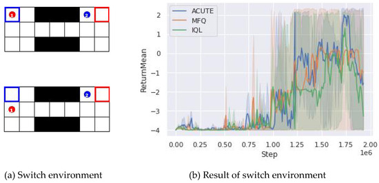 Switch environment is a grid world environment having two agents where each agent wants to move their corresponding home location (marked in boxes outlined in the same colors, as shown in Figure 4a). Agents must coordinate to pass through a narrow corridor that only one agent can traverse at a time. They need to cooperate and not block each others’ passages. When the agents reach their home zone, they will be rewarded. The game ends when both agents have either reached their home state or have taken a maximum of 20 steps in the environment.