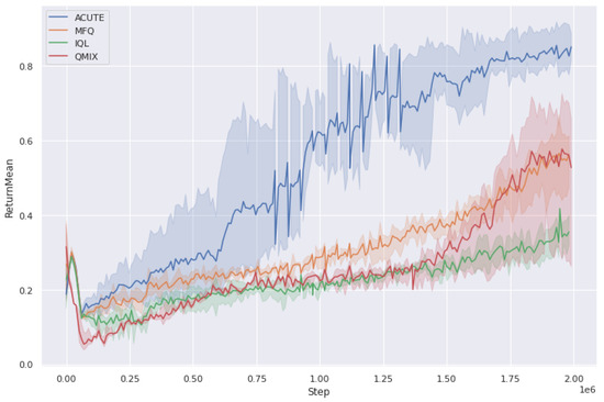 We compared three value-based methods in combat environments: ACUTE, MeanField-Q (MFQ) [26], and IQL [6]. Figure 2b shows the results for each algorithm after 4 million training steps. It is evident that ACUTE receives higher average rewards (blue line) than the other two methods. As we can see, these three algorithms have similar performances in the beginning. However, ACUTE relies on information sharing to obtain better results in the end, which indicates that our framework can effectively exploit helpful information from disordered messages.
