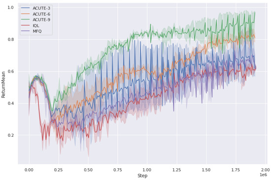 We select “5s-19 × 19-19p-9f” from LBF tasks. In this term, “5s” means that each agent can only see 5 × 5 squares centered on itself. In this 19 × 19 size environment, there are 19 agents and 9 food items. For ACUTE, we set different interference levels: “ACUTE-3” means that at each timestep, the agent will receive messages broadcast by any three of the other agents, “ACUTE-6” means that at each timestep the agent will receive messages broadcast by any six other agents, and so on. IQL does not require communication during training or execution for other value-based methods, so whether or not it interferes does not affect its performance. MFQ collects the action of other agents to obtain the average action as part of the input and does not consider communication interference, so the experiment for MFQ is based on a reliable channel. Each algorithm was run for 2 million timesteps in the environment. Figure 6 shows the performance of ACUTE-3, ACUTE-6, ACUTE-9, MFQ, and IQL in this LBF task. Each set of experiments was run three times to better evaluate these methods’ performance.