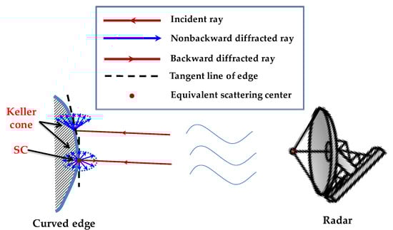 Based on GTD theory [1], edge-diffracted rays are distributed on a conical surface, called a Keller cone (as in Figure 2). Similar to the case of specular reflection, there is still only one ray that can return the radar, and the ray’s diffracted point on the edge can be seen as an effective SC.