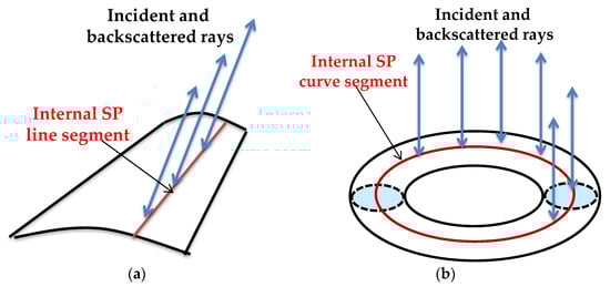 It is not hard to obtain , resulting in or , which corresponds to a singly curved surface and torus surface, respectively. Unlike the previous cases, there are countless rays that can return the radar, as illustrated in Figure 4. Therefore, the SP ‘point’ is no more a single point but a line or curve segment belonging to the distributed SC.