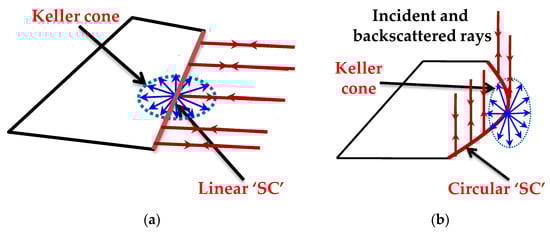 SC position and visible direction for the edge diffraction of the degenerate condition. (a) Straight edge, (b) axially incident circular edge.