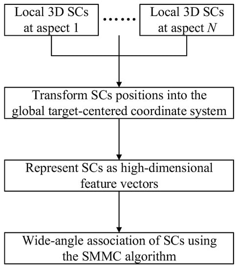 To fully characterize a target at all aspects, 3D SC extraction needs to be executed at various angles on a grid in terms of both the elevation and azimuth. After obtaining the local 3D SCs at various aspects, the work flow depicted in Figure 8 of wide-angle association using the SMMC algorithm was followed.